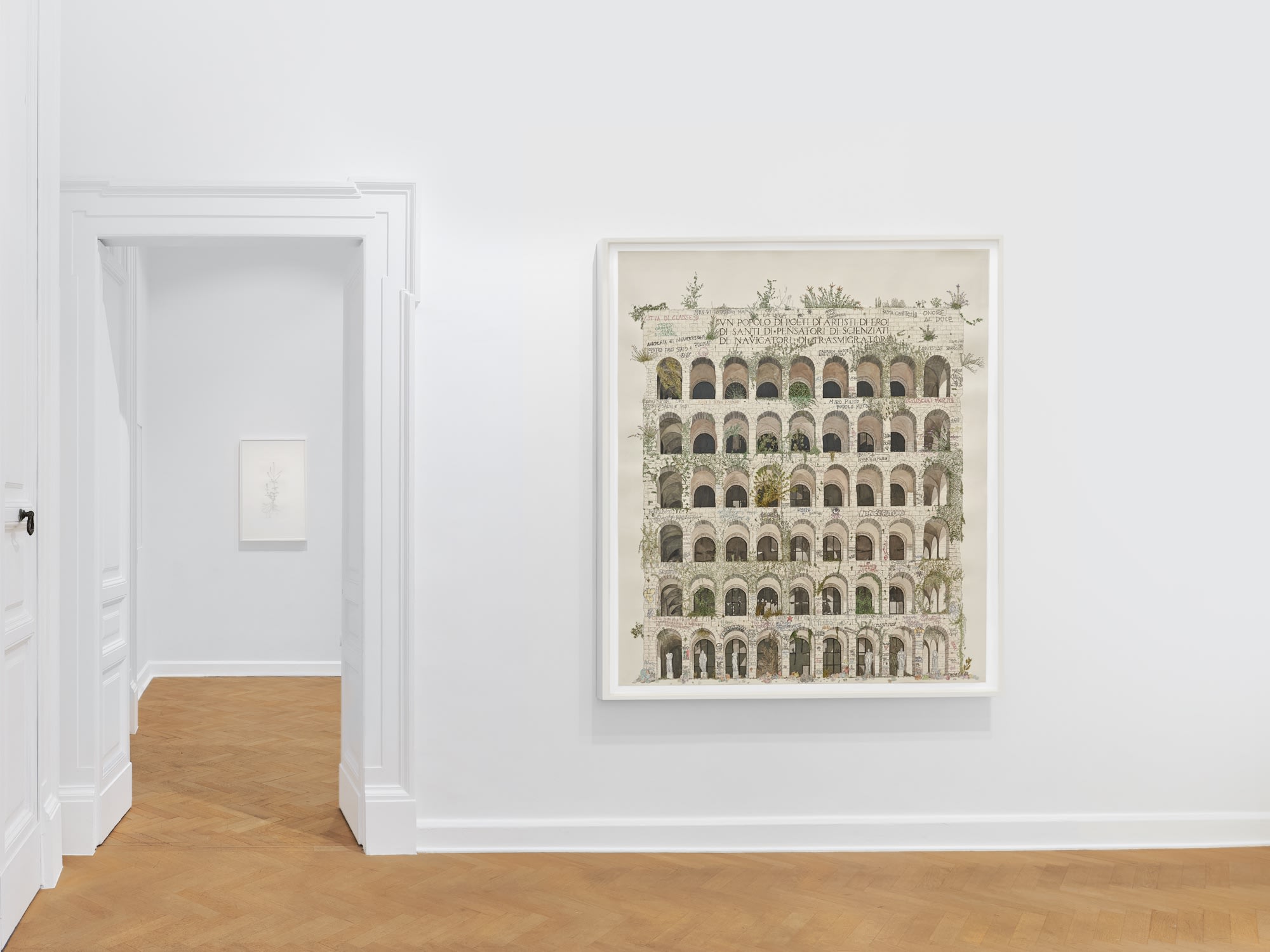 Landy and Wearing both came to prominence in the 1990s after studying at Goldsmiths in London, where they first met, in the late 1980s. Landy’s early work from this period presented a satirical view on the political and social climate of neoliberal Britain, producing works and installations in various media that interrogated issues of labour, consumerism and value. These concerns led to the landmark work Break Down (2001), in which Landy and a group of assistants systematically destroyed each and every one of the artist’s 7,227 possessions over the course of two weeks, in an audacious performative act staged in a former C&A department store building on Oxford Street, London. In the aftermath of Break Down, a tabula rasa in a creative and personal sense, the first works Landy produced were delicate etchings of common weeds found around London – an apposite subject matter symbolic of survival and renewal – which became the Nourishment series (2002–ongoing). For this exhibition Landy presents a group of new etchings of weeds encountered in the derelict nooks and on the roadsides of Naples, made during several visits to the city in 2024. The meticulously intricate renderings honour the overlooked and celebrate resilience, in a poetic ode to the city itself.