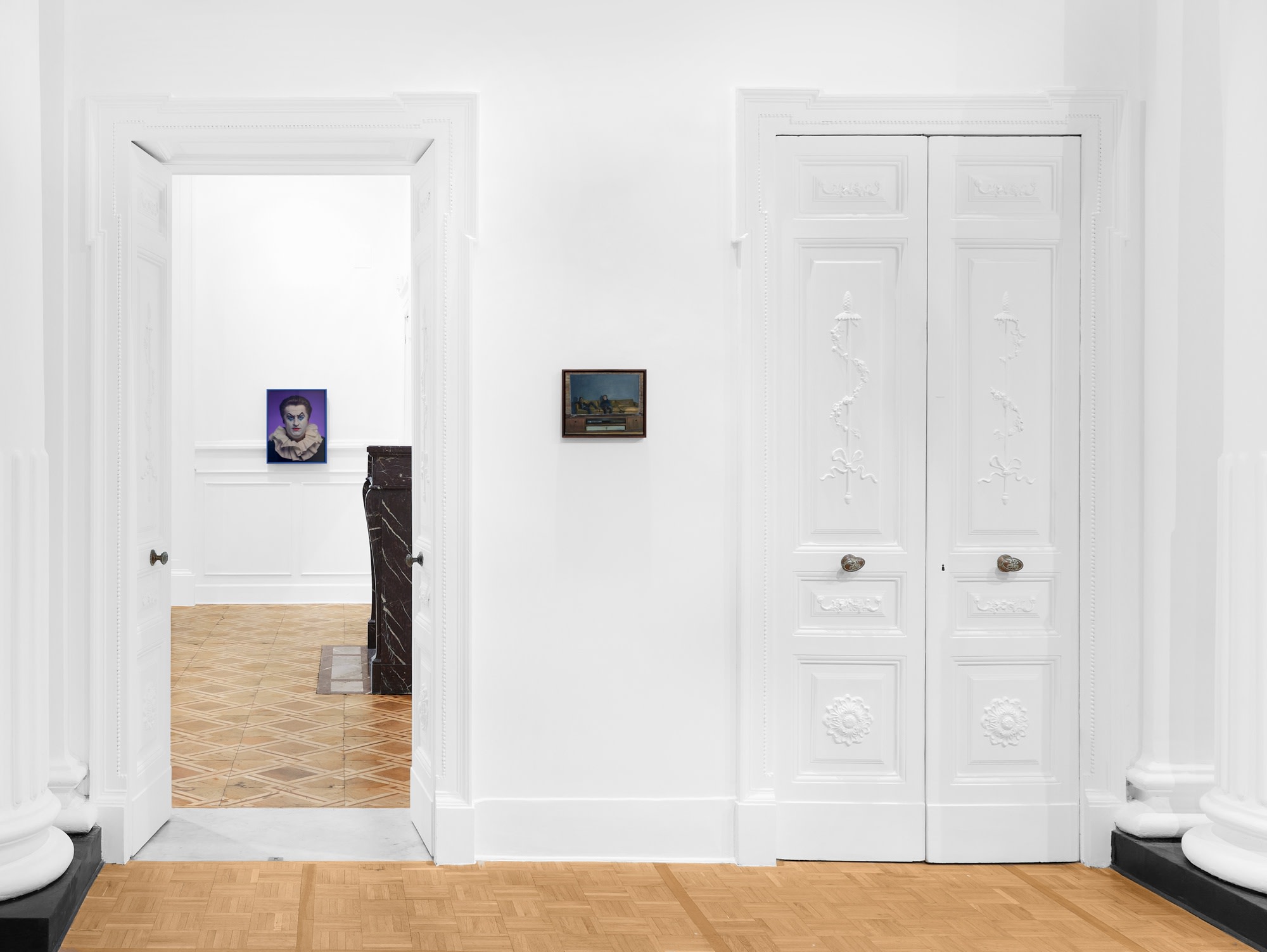 Gillian WearingSelf portrait and Michael (sitting room), 2024signed, dated versooil on canvas and board20.2 x 25.2 cm.8 x 10 in.